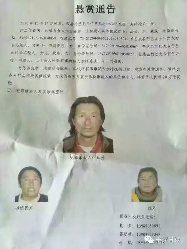 10月18日,甘孜藏族自治州公安局通过官方认证微信“平安甘孜”发布的通缉令显示,经工作查明,加措有重大作案嫌疑。加措生于1969年2月3日,芒康县竹巴龙乡竹巴龙村卡玛组人,在逃编号为“T5421290000002015030301”。其妻子四朗拥宗和女儿找弟协助犯罪嫌疑人加措外逃,并一同潜逃。