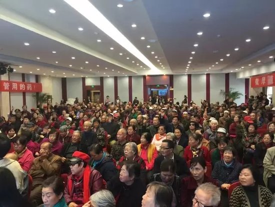 偌大的会场,黑压压地坐满了老人。每个椅背后面贴有序号标签,序号一直排到390多,最后一排座椅没有贴号,像是临时加设的。