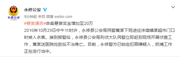 29日晚22时许,@永修公安 发布悬赏通告称,永修命案悬赏奖金从5万增加至20万。目前抓捕工作正在进行中,如有知情者,请向公安机关举报。