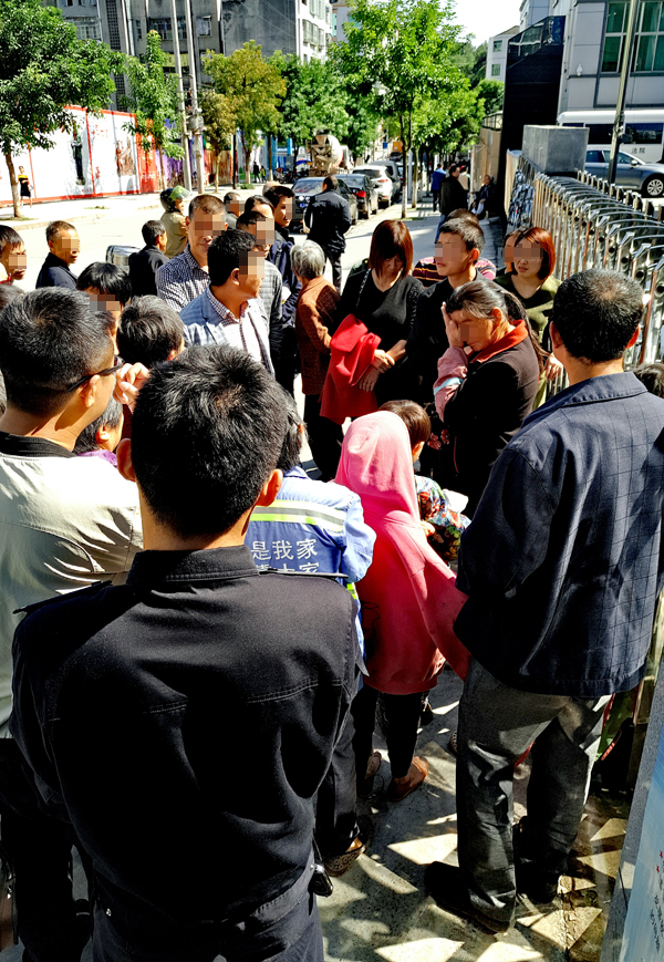 交涉后,张杏子和已成年的二儿子何君微进入法庭旁听,其余5个未成年的孩子在法院门口,由法院工作人员帮着照看。