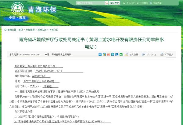 文章还称,在青海省环保厅的官方网站上已有一则关于黄河上游水电开发有限责任公司的处罚信息:该公司因为在羊曲水电站“三通一平”工程中环评未批先建,而受到青海环保厅的行政处罚。
