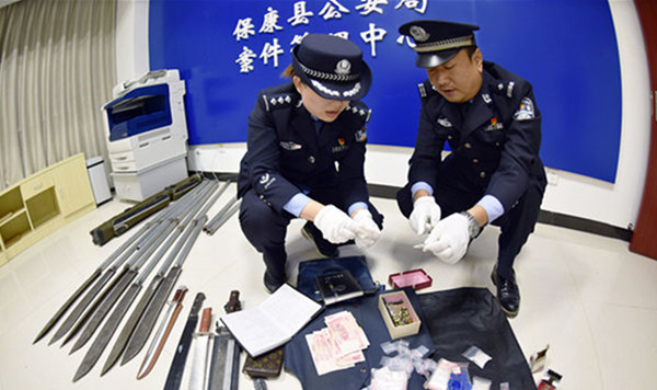 人民网保康10月31日电 10月30日晚,湖北保康民警对查获的毒品、子弹、刀具进行清点登记。