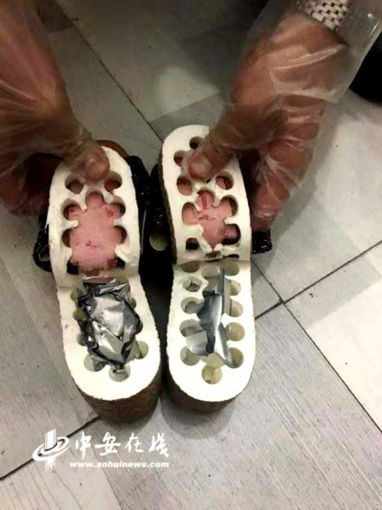 与此同时,另一路民警迅速缴获了已寄回到合肥的涉嫌装有毒品的快递包裹。连续打开多个包裹,民警发现里面只是普通的女士高跟鞋。但在高跟鞋的鞋跟处,民警还是发现了异常。“鞋跟有切开再粘上的痕迹,打开一看里面装有冰毒疑似物。”