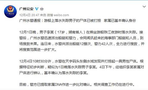 中新网12月5日电 据广州市公安局官方微博消息,12月1日,湖南一男子乘船在珠江夜游时落水失踪,4日警方从水中打捞出一具尸体,家属已基本确认其为落水失踪的李某。