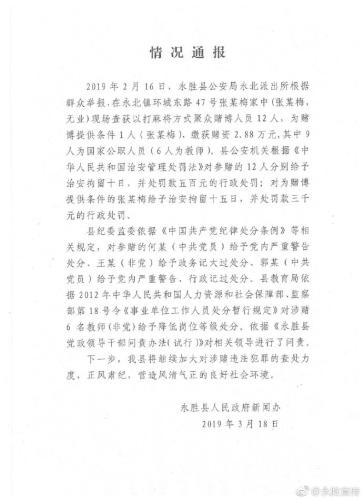 通报指出,2019年2月16日,永胜县公安局永北派出所根据群众举报,在永北镇环城东路47号张某梅家中(张某梅,无业)现场查获以打麻将方式聚众赌博人员12人,为赌博提供条件1人(张某梅),缴获赌资2.88万元,其中9人为国家公职人员(6人为教师)。县公安机关根据《中华人民共和国治安管理处罚法》对参赌的12人分别给予治安拘留十日,并处罚款五百元的行政处罚;对为赌博提供条件的张某梅给予治安拘留十五日,并处罚款三千元的行政处罚。