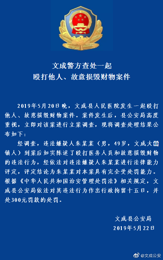 针对“国家公职人员朱某某殴打儿科主任”一事,22日,浙江温州文成县公安局官方微博发布警情续报称,文成县公安局依法对朱某某违法行为作出行政拘留15日,并处300元罚款的处罚。