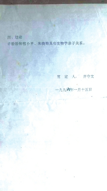 1996年1月15日,河南省高院出具了(1995)豫法医鉴字第19号《河南省高级人民法院亲子关系鉴定》,结论为许盼盼与朱晓娟夫妻具有生物学亲子关系。