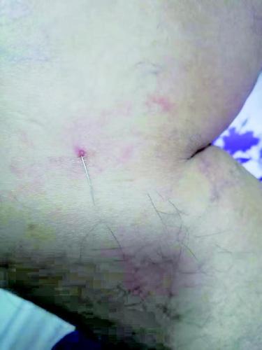 褚福华介绍,导丝正是从右膝处取出。