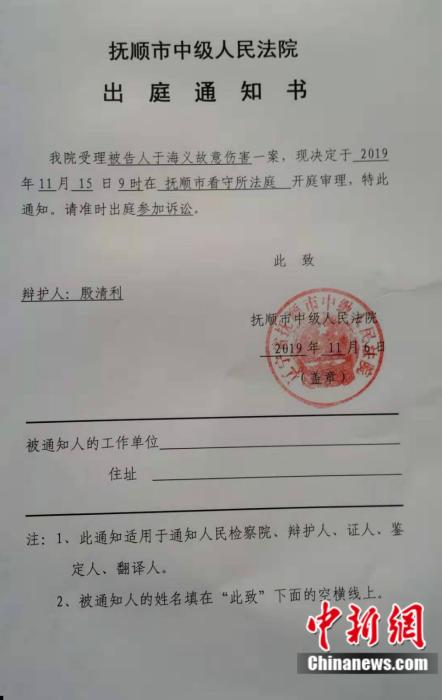 抚顺中级人民法院出具的出庭通知书 殷清利供图