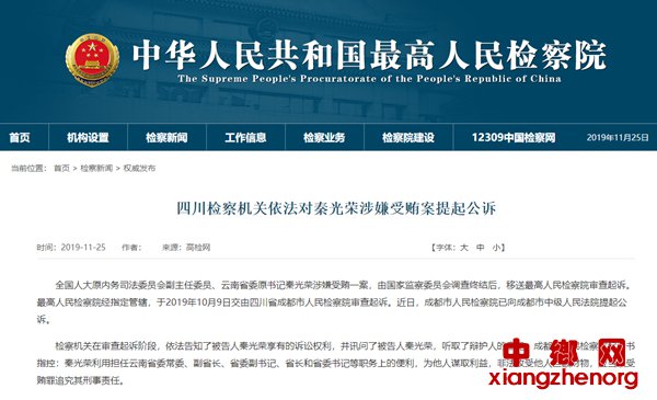 人民网北京11月25日电 (朱紫阳)据最高人民检察院消息,全国人大原内务司法委员会副主任委员、云南省委原书记秦光荣涉嫌受贿一案,由国家监察委员会调查终结后,移送最高人民检察院审查起诉。最高人民检察院经指定管辖,于2019年10月9日交由四川省成都市人民检察院审查起诉。近日,成都市人民检察院已向成都市中级人民法院提起公诉。
