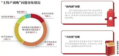 排查整治“天价烟”方面,国家烟草专卖局深入推进“天价烟”问题专项检查和集中整治,严肃查处领导干部利用烟草专营权谋取私利问题,立案111起,处理300人,通报曝光典型案例81起。多个省份开展专项整治,查处了一批干部。