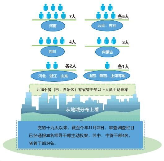 《法制日报》记者逐条梳理中央纪委国家监委网站执纪审查信息发现,党的十九大以来,截至今年11月22日,审查调查栏目已经通报38名领导干部主动投案。其中,中管干部4名,省管干部34名。