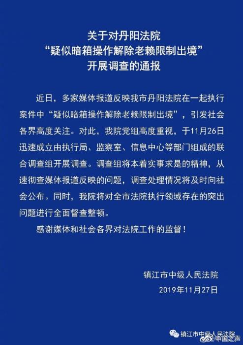 对于此事,镇江市中级人民法院27日回应称,11月26日已经成立了由执法局、监察室、信息中心等部门组成的联合调查组开展调查,调查处理情况将及时向社会公布。与此同时,镇江中院还将对全市法院执行领域存在的突出问题进行全面督查整顿。事件进展,中国之声将持续关注。