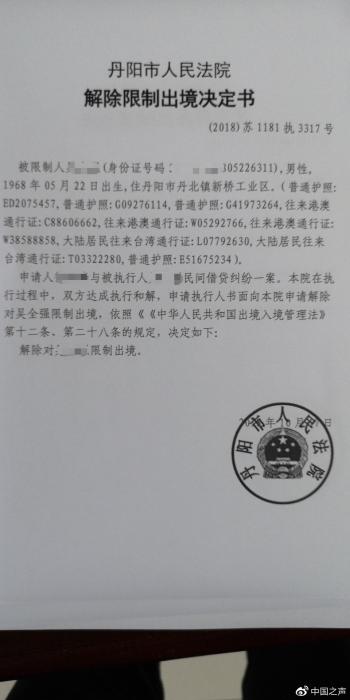 2018年8月,丹阳市人民法院出具了限制吴某某和妻子魏某出境的决定书。两个多月后的10月17日,一份解除限制吴某某夫妇出境的决定书明确,“双方达成执行和解,申请执行人书面向本院申请解除对吴某某限制出境”。