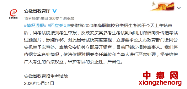 安徽省教育厅官微发布一则通报称,安徽省2020年高职院校分类招生考试于昨天上午结束,省考试院接到考生举报,反映安徽省安庆某县考生考试期间利用微信向外传送考试试题图片,涉嫌作弊。对此安徽省考试院高度重视,立即要求安庆市教育部门会同公安机关予以查处。当地公安机关立即展开调查,目前已锁定相关当事人。通报称,将依据立案查处情况,依法依规对相关责任单位和当事人进行严肃处理,坚决维护广大考生的合法权益,维护考试的公正性、严肃性。