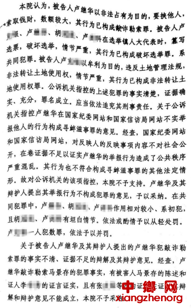 一审判决书内容显示,法院未认定检方对卢继华寻衅滋事的指控,“国家纪委网站和国家信访局网站,对反映人的反映事项内容不对社会公开,不足以证明卢继华的举报造成了社会秩序严重混乱,其行为也不符合构成寻衅滋事罪的其他法定情形”。