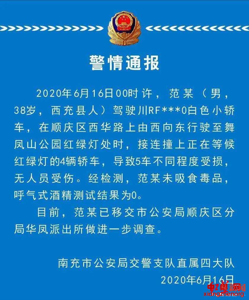 6月16日下午,南充市公安局交警支队直属四大队就此事发布警情通报称,6月16日0时许,范某(男,38岁,西充县人)驾驶一辆川R牌照的白色小轿车,在顺庆区西华路上由西向东行驶至舞凤山公园红绿灯处时,接连撞上正在等候红绿灯的4辆轿车,导致5车不同程度受损,无人员受伤。