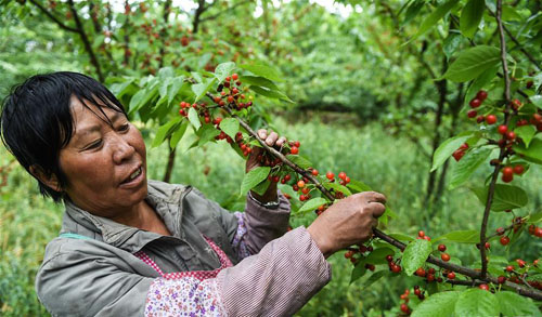 4月24日,农户在六枝特区岩脚镇新寨村樱桃产业扶贫基地采摘樱桃。近年来,贵州省六盘水市六枝特区按照“农业生态化、生态产业化”的思路,把地方土特产和小品种农业做成带动农民增收的大产业。投资3亿元建设“凉都红”樱桃产业扶贫基地,项目覆盖农户1230户,户均增收7460元。同时大力推广“山地特色农业+乡村旅游”模式,实现农旅一体与“三变”(资源变资产、资金变股金、农民变股东)融合发展,助力乡村振兴。新华社记者 陶亮 摄