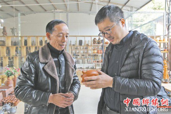 桂花龙窑掌门人兰章树(左)与陶艺专家李东(右)一起探讨新研发的产品器型设计