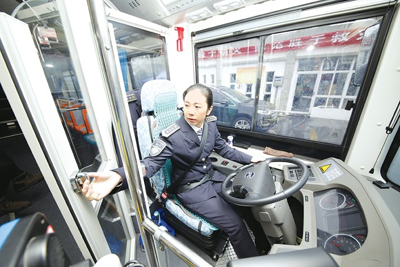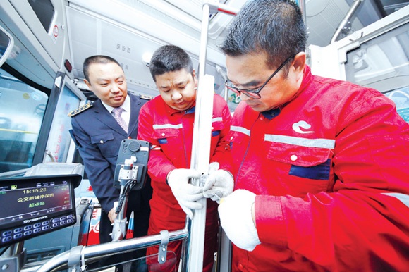昨日,淮安城市公交公司机修人员在对透明的驾驶隔离门进行检查。据悉,从2016年起我市投放的新型公交车都增设了驾驶室隔离装置,保障司机开车免受干扰。(王昊 谈平)