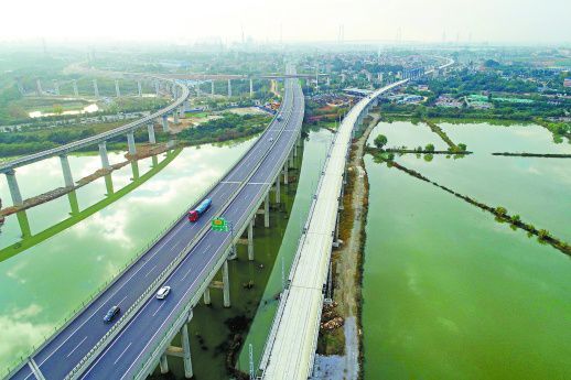 11月9日,已完成主体施工的蒙华铁路岳阳段26标项目(右)开始铺轨。中为杭瑞高速。