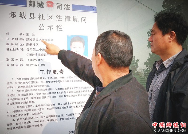 (中国乡镇网山东讯)11月15日,山东省郯城县马头镇两位法律咨询者正在高册社区门前,观看公示栏里社区律师顾问到基层“上岗”的具体时间。至此,郯城县司法己为所有的基层社区配备专业律师,实现了“一社区一法律顾问”的管理模式。