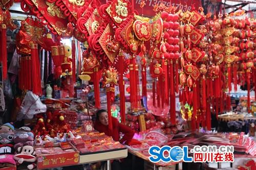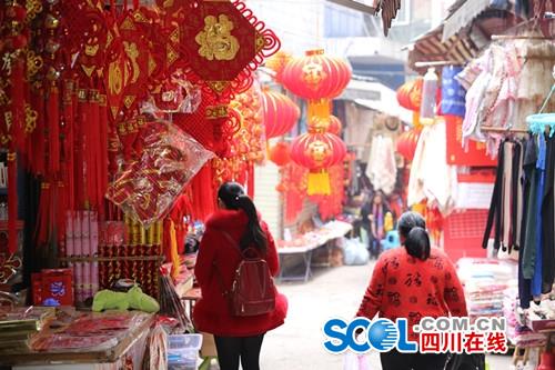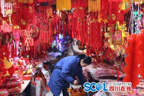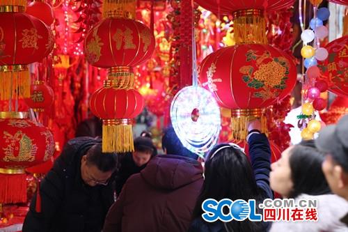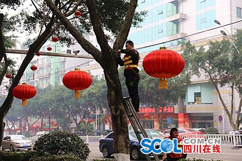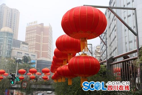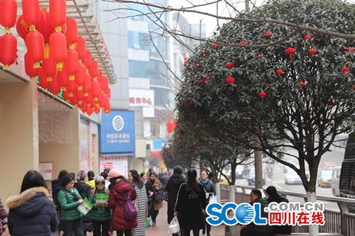 四川在线泸州消息(实习生 田雨 何流)新春临近,年味也越来越浓。今日上午,记者走访了泸州市各大商业街,大大小小的红灯笼、中国结、福字等已经挂满街头,众多年货小商品相继亮相。记者注意到,出街的市民也搭上了“中国年味”的快车,穿上了红衣服,围上红围巾,融入到喜气洋洋的年味气氛中。记者路过石马沟菜市场发现,数名工作人员正在悬挂火红的灯笼,放眼望去,一排排大红灯笼横跨整条大街,为酒城的街头增添了不少喜庆色彩。市民李先生说:“看到街道上挂起了这么多红灯笼,想到马上就要过年了,心里特别开心。”