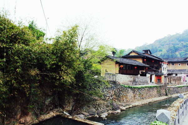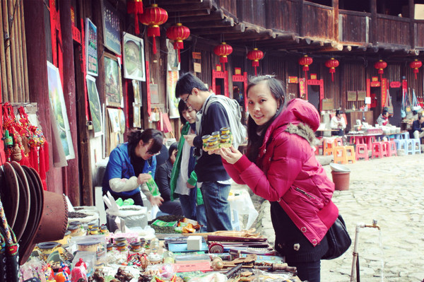 土楼的大门前,偶尔会有村民卖一些食品,都是这里的特产,不妨买来品尝,很好吃。沿着河道走,还可以看到不同的土楼,只是土楼的游玩我们只用了一整天的时间,在我看来还是有些不够,最好安排两天,住上一个晚上就会更好的了解土楼文化了。