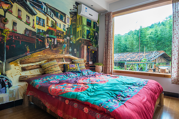 这里还有一个著名的“猪窝”,它深藏在贤良村内,由原本的猪窝改造而成,外墙涂抹着艳丽夸张的壁画,二楼还有一个开阔的露天平台,稍稍踮起脚尖,便能看到不远处的银杏林,在这里,你可以遇见来自四面八方的朋友,一同去溪涧里打闹玩耍,一同躺在露台上数星星,一同到稻田里进行一场稻田婚礼,让青春的张扬跟古老静谧的村庄来一个碰撞。