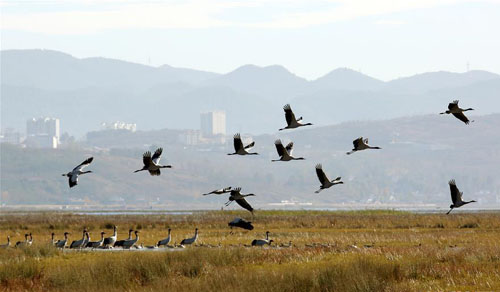这是在贵州威宁草海国家级自然保护区拍摄的黑颈鹤(11月16日摄)。