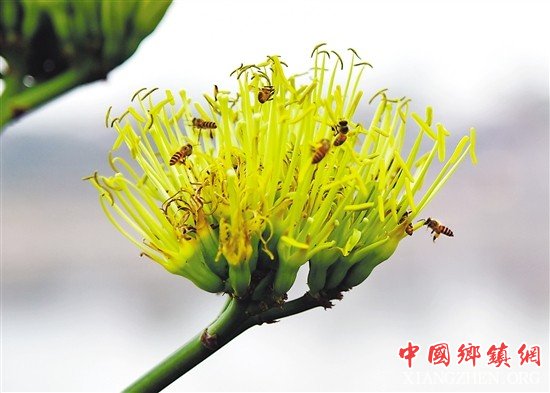 园中一株珍贵的龙舌兰开花了,花茎有3米高,最粗的地方直径在2厘米以上,花球从花序向两边延伸,目前十多个花球都盛放了,陆续还将有更多花球绽放,每天引来上千只蜜蜂采蜜。据说龙舌兰要长到70~80岁才能开花,而且一开完花就死亡,被人们称为“世纪植物”和世界上“最稀罕的花”。