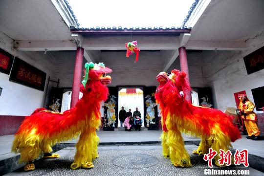 2月14日,江西省万载县黄茅镇源头村村民表演舞狮迎新春。 邓龙华 摄
