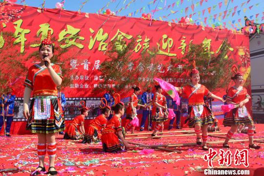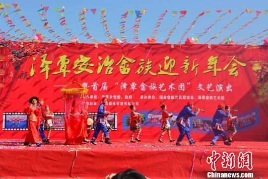 2月14日,江西省瑞金市泽覃乡安治畲族村举办迎新年会暨首届“泽覃畲族艺术团”文艺演出。 朱燕 摄