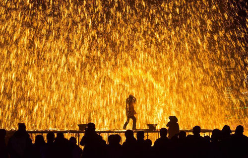 “打树花”是河北省张家口市蔚县特有的传统民俗文化活动,已有五百多年历史,用来祈求五谷丰登、日子红红火火。
