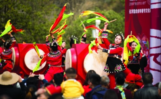 春节期间,孔学堂庙会上依然刮起“多彩贵州风”。芦笙舞、侗族大歌、锦鸡舞、七月火把节、情姐下河洗衣裳……苗族、布依族、彝族等多民族歌舞舞步欢快、歌声动人,穿插着打糍粑、竹竿舞等互动节目,年味浓浓。来自贵州少数民族歌舞艺术中心的几十位民族演员,因此放弃了和家人的团圆时光,天天为市民游客奉上精彩表演。
