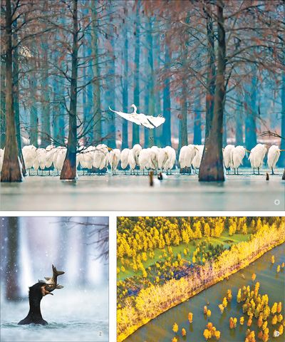 图②:捕食(摄于2018年1月)。本报记者 韩俊杰摄 图③:池杉湖湿地。资料图片