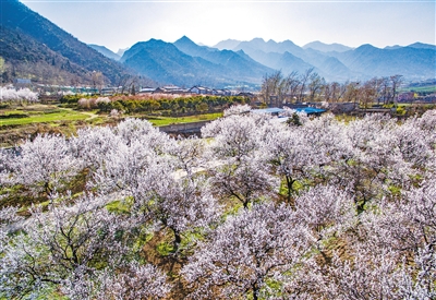 3月14日,鄠邑区将军山古镇四周盛放的杏花开满山坡。 首席记者王健 摄
