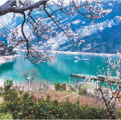船舶驶出长江三峡西陵口,吐艳的桃花与挂满枝头的柑橘交相辉映。 文振效摄