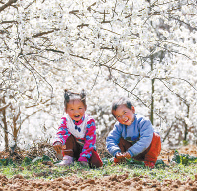 两名小朋友在贵州省威宁县龙街镇的樱桃园内玩耍。 何 欢摄