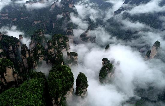 5月6日,雨后的湖南张家界武陵源风景区,漫天的云雾从天而降,飘洒萦绕在连绵的峰林间。吴勇兵 摄