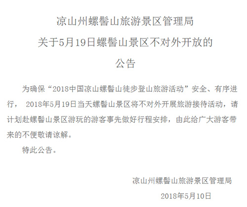 人民网成都5月16日电 (任重)据凉山州螺髻山旅游景区管理局官网消息,为确保“2018中国凉山螺髻山徒步登山旅游活动”安全、有序进行, 2018年5月19日当天螺髻山景区将不对外开展旅游接待活动,请计划赴螺髻山景区游玩的游客事先做好行程安排。