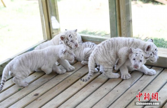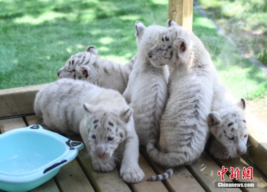 5月20日,雪虎五胞胎嬉戏玩耍。