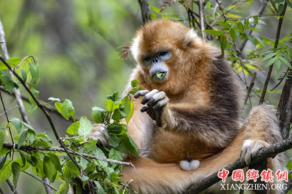 5月20日,一只金丝猴在神农架国家公园大龙潭金丝猴野外研究基地山林中进食树叶。