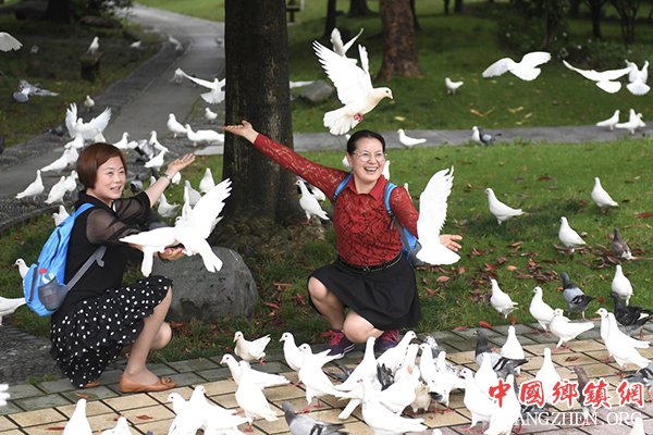 5月27日,游客在浙江省宁波市奉化区滕头村农家风情生态旅游区喂鸽子。