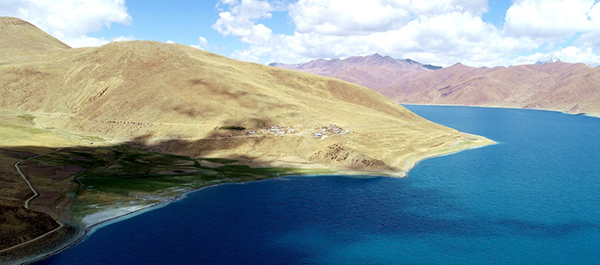 羊卓雍错湖畔的村庄(5月27日无人机拍摄)。
