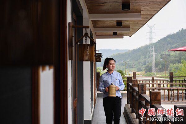 江宁龙乡·双范精品民宿村的工作人员在客房外行走(6月4日摄)。