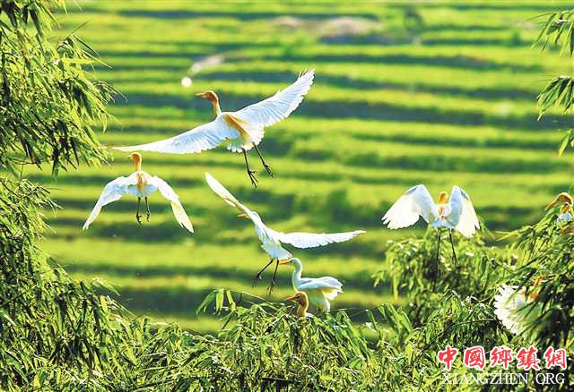 6月2日,丰都县十直镇上坝村,一群白鹭在竹林嬉戏。上坝村位于三条河流交汇处,该村加强环境整治,使水清岸绿,大量鸟类在此栖息,其中白鹭有上千只。