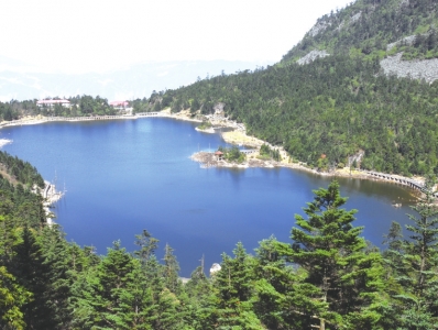 郁郁葱葱的森林中,螺髻山清澈的湖泊仿佛一面面镜子,倒映着树丛峰群和云影天光。