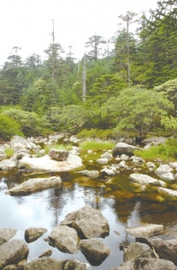 说黑龙潭是冰川湖泊,从其周边的地理结构便大致知道湖泊的成因--水源由西北流来,虽然不是可见的明河,但依次绕过它上面更高几层山地散布的牵手湖、玉髻湖、仙草湖、仙鸭湖、雪茶湖、幽恋湖,就知道这些湖泊的水系其实都是相互关联的,高处的水通过暗河或者浸透,流向了低处的湖泊。而黑龙潭东南方向的出水口,正是前文提到的大冰窑口,水流依山势而下,就是清水沟。除了在大冰窑口的豁口及向下的溪谷有冰川刻槽外,湖泊旁到处可见大大小小的冰川漂砾,冰川石坡成片的地方,几乎难以生长植物,只有冷杉、杜鹃和灌木的衬托,非常显眼。