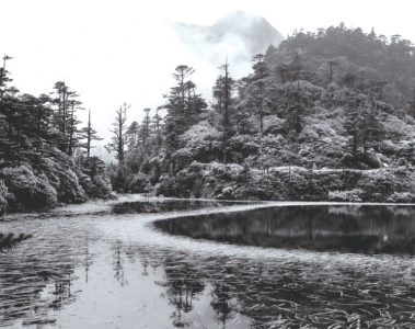 日海补杰惹觉得从左边的路先上山,然后从高处俯瞰黑龙潭,才能真正看出黑龙潭的幽深和美丽。我们听从他的建议,在岩石与森林的簇拥下转了7个小时后终于来到一个山垭口,看到远处有一面镜子静谧地躺在山腰。这时的黑龙潭湖面呈黑色,越靠近湖边,因为茂密森林的倒影,颜色越黑。惟有山势敞开的那一面,时而云雾蒸腾,遮蔽了边缘,似湖水与天空相连;时而把蓝天白云揽入水面,幻化出更加旖旎的如同海市蜃楼般的景色。
